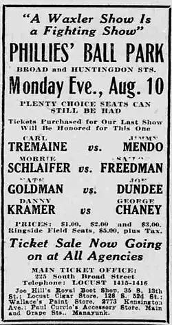 - ^ "Godfrey Loses to Carnera on Foul in Fifth: 35,000 See Giant Italian Triumph When Struck Low by Negro at Phillies' Park". The Philadelphia Inquirer. Philadelphia, Pennsylvania. June 24, 1930. p. 1.
