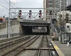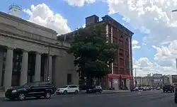 The active and in-use North Broad station serving SEPTA Regional Rail's Lansdale/Doylestown Line and Manayunk/Norristown Line stands behind the former station building.