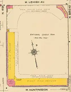 The ballpark's first base line ran parallel to Huntingdon Street; right field to center field parallel to North Broad Street; center field to left field parallel to Lehigh Avenue; and the third base line parallel to 15th Street. The stadium was demolished in 1950.