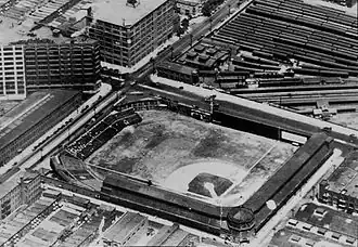 ![]() A 1928 aerial view of Baker Bowl with the soon-to-be-demolished Huntingdon Street station (at right) in Philadelphia | |