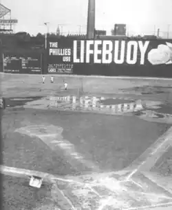 While the Phillies were occasionally at least respectable in the dead-ball era, once the lively ball was introduced the team became less competitive.[35] It was an extremely hitter-friendly park, making it an especially difficult place to pitch. For a number of years, a huge advertising sign on the right field wall read "The Phillies Use Lifebuoy", a popular brand of soap. This led to the oft-reported quip that appended "... and they still stink!" In 1936, a vandal snuck into the Baker Bowl one night and actually wrote that phrase on the Lifebuoy ad.[36] Conventional wisdom ties their failures to the Baker Bowl, but they often finished poorly in Shibe Park as well.