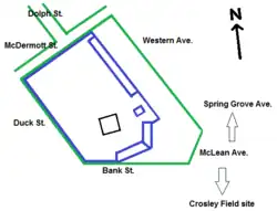 The ballpark was located northwest of the intersection of Bank Street and McLean Avenue, just three blocks north on McLean from the future site of Crosley Field. Its location has typically been described as "the foot of Bank Street." Contemporary maps which include a rough diagram of the ballpark clarify its location and orientation: Bank Street (south, third base); houses and McLean Avenue transitioning to Spring Grove Avenue (southeast, home plate); Duck Street (southwest, left and center fields); McDermott Street (northwest, center and right fields); houses and Western Avenue (northeast, first base).[1] Once the park was abandoned, Dolph Street was run through the property to extend to Bank, paralleling Western.