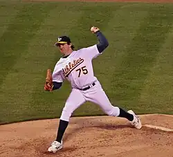 In 2001, Zito Switched his uniform number to 75 (which he would wear throughout the rest of his career) and finished third in the American League (AL) in strikeouts per nine innings (8.61), fourth in strikeouts (205), sixth in wins (17), eighth in ERA (3.49), and tenth in winning percentage (.680).[16] Zito became the sixth lefty aged 23 or younger since 1902 to strike out at least 200 batters in a season. After a great rookie season, Zito struggled through the early part of the 2001 season, posting a 6–7 record with a 5.01 ERA in his first 22 starts. However, he rebounded nicely and by August, he was putting up good pitching numbers. Zito was named Pitcher of the Month in August, going 5–1 with a 1.02 ERA. Zito won Pitcher of the Month again in September, going 6–0 with a 1.89 ERA. During those last two months of the season, Zito went a combined 11–1 with a 1.32 ERA, best in baseball.[5][19]