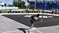 The game revolves around two teams of five players taking turns playing offense and defense, with each of the offensive team's players taking turns hitting a small rubber ball with their bare hands into the field of play (which is a 21 m (68.90 ft)-square),[3] and then running counterclockwise around four bases (13 m (42.65 ft) apart) laid out in a square shape to score a run, while the defensive team tries to eliminate ("get out") offensive players before they complete their trip around the bases to prevent them from scoring. Outs (eliminations) occur either when a hit ball is caught before it touches the ground by a defender, or (in specific situations) when a defender with the ball either touches the base a runner is supposed to reach, or touches the runner themselves. Offensive players can also get themselves out by breaking the rules while hitting the ball or running the bases.