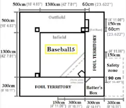 The infield is a 13 m (42.65 ft)-square, with a base in every corner. The fair territory is a 18 m (59.06 ft)-square, with one of the corners coinciding with the home plate (the final base). The batter's box is a 3 m (9.84 ft)-square. It is placed outside of the fair territory and is built on the extension of the two foul lines (which distinguish fair and foul territory, and sit in fair territory) crossing each other at the home plate corner; the lines are included as part of the batter's box area.[6]