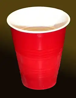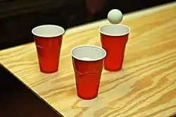 The most common cups used are 16-ounce disposable plastic cups with ridge-lines which can be used precisely to measure the amount of beer to be poured into the cup. 38 mm or 40 mm table tennis (ping pong) balls are typically used for game play.