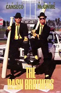 Costacos Brothers Inc., a poster company, had already planned a photo shoot with the slugging duo for a concept that was originally titled the "Blast Brothers", but the advent of the forearm bashing motivated a change to the "Bash Brothers".[16] While the industry standard at the time was to show action shots of athletes, Costacos Brothers gave their subjects amusing personas matched with catchy slogans.[17] The Bash Brothers poster was patterned after characters popularized by comedians Dan Aykroyd and John Belushi.[11] Canseco and McGwire were made to look like a bigger and meaner version of The Blues Brothers who were also partial to some yellow in their attire—yellow being an A's team color along with green.[5][18] Wearing black suits, black shoes, black hats, black sunglasses, yellow socks, yellow shirts, green skinny ties, and fedora hats, the duo posed in front of an Oakland Police patrol car while holding giant 5-foot (1.5 m) baseball bats.[5][9][16] The poster sold 50,000 copies in the San Francisco Bay Area in less than three weeks.[19] It was as popular as any poster that Costacos had done, and it received immense press coverage.[16]