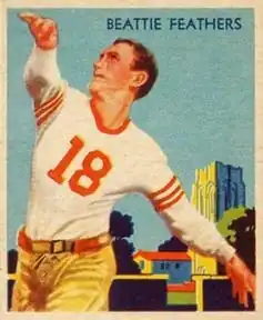 Feathers played professional football in the National Football League (NFL) with the Chicago Bears, Brooklyn Dodgers, and Green Bay Packers from 1934 to 1940. In his rookie season of 1934 he became the first player in NFL history to rush for over 1,000 yards in one season.[2] His average of 8.44 yards per attempt that same year remains an NFL record (minimum 100 carries). He also, as of 2024, is the only NFL player to have outrun the passing leader in a single season (he outran passing leader Arnie Herber by 205 yards that season). As of 2024, his 91.3 yards per game is also a Bears rookie franchise record. Feathers is one of ten players named to the National Football League 1930s All-Decade Team who have not been inducted into the Pro Football Hall of Fame.[3]