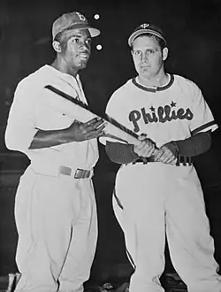 On May 10, with the Phillies and Dodgers again playing each other, this time in Philadelphia, as a means of easing tensions, Robinson and Chapman posed together for a picture. Chapman himself initially stated that the picture was his idea, but then later stated that such had come from Phillies management. Regardless, Robinson's teammate Dixie Walker stated, "I never thought I'd see old Ben eat shit like that."[15] In his own memoir, Robinson noted, "I can think of no occasion where I had more difficulty in swallowing my pride and doing what seemed best for baseball and the cause of the Negro in baseball than in agreeing to pose for a photograph with a man for whom I had only the very lowest regard".[16]