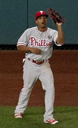 On December 6, 2012, Revere was traded to the Philadelphia Phillies in exchange for Vance Worley and Trevor May.[17] Revere was picked to lead off the Phillies' Opening Day lineup for the 2013 season against the Atlanta Braves over Jimmy Rollins after a strong spring training performance.[18] After acquiring Revere, Phillies General Manager (GM) Rubén Amaro Jr. said, "He can go to the top of the order or bottom of the order. Either way, for us it was about the defense and the speed. We like athletic players and he's certainly that. He has great energy, a fantastic defender. And those are priorities for us."[19]
