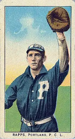 Following the 1910 season, Beavers' manager Walt McCredie announced Rapps would be returning as the team's first baseman.[56] He stayed in Portland with his family during the off-season.[57] Rapps executed a hidden ball trick putout on Clarence McDonnell during the sixth inning of a game against the Vernon Tigers on September 17, 1911.[58] During the tenth inning of a game against the Oakland Oaks on September 21, 1911, Rapps was struck on the top of the head by a pitch from Jack Flater.[59] The following day, Rapps was called on to pinch hit in a tied 3–3 contest against Oakland in the ninth inning and drove in the winning run.[60] During the 1911 season, Rapps had a .279 batting average with 35 doubles and six triples.[13] The Beavers won the Pacific Coast League pennant in 1911.[61] Following the season, Rapps played on an indoor baseball team in Portland with Beavers teammates Bill Steen, Nick Williams and Art Kruger.[62]