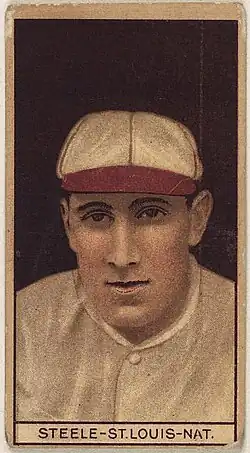 June 11 marked a turning point in Steele's season. After giving up four runs in the first inning to the Boston Rustlers, Steele pitched scoreless ball for the rest of the game. The Cardinals won 5–4, a victory that moved them into fourth place in the league after a rough start to the season. The victory was the first in a span of 10 decisions lasting through July 19, where Steele would lose only once. Teammate Miller Huggins thought he did "excellent work" on the mound during this time.[1] He gave up six runs but got the win in a complete game, 8–6 victory over the Rustlers on July 13 that left the Cardinals just two games out of first place in the NL.[1] After July 19, his pitching became less consistent, and he won only two of his final nine decisions. His victory over the Philadelphia Phillies on August 17 is notable for being the only shutout of his career; Steele gave up just five hits in the game.[1] Steele finished the season having appeared in 43 games, 34 of which were starts, 23 of which he completed. He posted a 3.73 ERA in a career-high 287+1⁄3 innings and had an 18–19 record, tying Earl Moore of the Phillies for the NL lead in losses.[1] With a 75–74 record, the Cardinals finished in fifth place in the NL.[1]