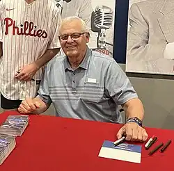 Boone was drafted by the Philadelphia Phillies in the sixth round (126th overall) of the 1969 amateur draft[1] after attending Stanford University where he was admitted to the Zeta Psi fraternity. He was brought to the majors in late 1972. While Boone never had excellent hitting numbers, he was an excellent defensive catcher, committing only eight errors and allowing only three passed balls in the 1977 season. Boone made the National League All-Star team three times in a Phillies uniform and helped the team win the 1980 World Series. In 1981, he batted .211/.279/.295.