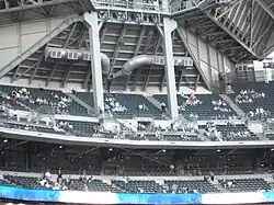 Uecker appeared in a series of Miller Lite commercials starting in the 1980s. In one commercial from that decade, Uecker was seen preparing to watch a baseball game when an usher informs him he is in the wrong seat. Uecker pompously remarks, "I must be in the front row", which became another of his catchphrases. The punch line was that Uecker's seat was actually in the nosebleed section. Since then, the farthest seats from the action in some arenas and stadiums have been jokingly called "Uecker seats". There is a section of $1 seating called the "Uecker seats" at American Family Field, the baseball stadium of the Milwaukee Brewers. Referencing where Uecker sat in the Miller Lite commercials, these seats have an obstructed-view area (in the upper grandstand above home plate where the stadium's roof pivot comes together). Another of Uecker's catchphrases from the aforementioned Miller Lite "front row" commercial is, "He missed the tag!" which he yells with confidence from his seat in the top row of the upper deck of the stadium, far away from the action.[33]