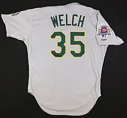 A two-time All-Star (1980 and 1990), Welch won 14 or more games in eight years, with a career-high 27 in 1990. He received the Cy Young Award that season, and was considered in the MVP vote. His 27 wins were the most by any pitcher since Steve Carlton also won 27 in 1972, and as of 2023 stands as the last time a pitcher has won 25 or more games in a season (the closest anyone has come to that mark since is 24, accomplished by John Smoltz in 1996, Randy Johnson in 2002, and Justin Verlander in 2011). The last pitcher to win more games in a season was Denny McLain, with 31 wins in 1968.[4] Nineteen of his wins were saved by Dennis Eckersley, which remains a record.[5]