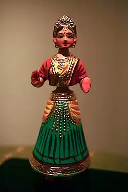 Thanjavur dolls are a type of Indian bobblehead doll known as "Thanjavur Thalayatti Bommai" in the Tamil language, meaning "Tanjore Head-Shaking Doll." They are a native art form in the Thanjavur region of Tamil Nadu. These dolls are usually 6" to 12" tall (15 to 30 cm). They are made of clay or wood and painted over in bright colors, and they are often dressed up in fancy clothes.[25] They form part of an elaborate display of dolls known as "Golu (kolu)," exhibited in Indian houses during the "Dasara (Navaratri)" festival in September-October.[26] These dolls are examples of how to start separating the movements of three distinct parts of the body, namely the head, torso, and hip and skirt parts.