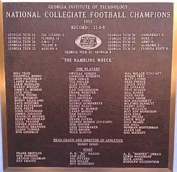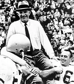 Dodd considered his two biggest victories to have come against Alabama, including a 7–3 victory in 1952 and a 7–6 victory in 1962.[43] The former victory secured a perfect season for Georgia Tech which led to a national title. The latter victory came against a top ranked Alabama team and cost the Crimson Tide another national title.[43][44][45] Alabama head coach Bear Bryant once said that he would rather look across the field and see anyone other than Bobby Dodd.[36]