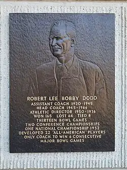 Dodd was inducted into the College Football Hall of Fame as a player in 1959 and as a coach in 1993.[4] He was voted Southeastern Conference Coach of the Year by his fellow coaches in 1951, and "National Coach of the Year" by the New York Daily News poll in 1952. After retiring, he was awarded a special "Citation of Honor" by the Football Writers Association of America for his accomplishments and contributions to football. Dodd also developed 22 recognized All-America football players as head football coach.[58] Dodd was also inducted into the Virginia Sports Hall of Fame in 1973.[59] Coach Dodd has also received honors not related to football. The Bobby Dodd Institute is an organization that helps people with disabilities; it is named in honor of Coach Dodd for his assistance to the disabled.[60]