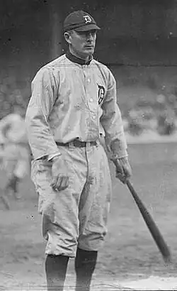In early September, Veach was purchased by Detroit from Indianapolis.[5] He was promptly inserted into the Tigers' lineup, replacing Davy Jones as the left fielder in an outfield that included future Baseball Hall of Famers Ty Cobb and Sam Crawford. Veach made his major league debut on September 6, 1912, at age 24. He appeared in 23 games for Detroit in 1912, compiling a .342 batting average in 79 at bats.[7] Veach remained the Tigers' starting left fielder for 12 years.[7]