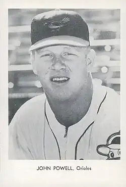 Powell signed with the Baltimore Orioles as an amateur free agent in 1959.[6] Jim Russo (the scout who signed him) was also the scout who would sign Jim Palmer and Dave McNally.[7] Powell joined the Orioles after leading the International League in home runs at Rochester in 1961.[8] He had a .321 batting average, with 32 home runs, 92 runs batted in (RBI) 86 runs scored, and a .981 OPS (on-base plus slugging).[9] In addition to leading the IL in home runs, he was fifth in batting, first in OPS, first in slugging percentage (.593), second in RBIs, and sixth in runs.[8]