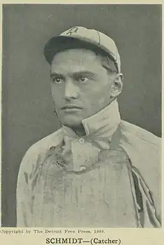 In late August 1905, the Minneapolis Millers sold Schmidt, Davy Jones, and Ed Siever to the Detroit Tigers.[6] Schmidt was initially a holdout from the Tigers' 1906 training camp, but he finally reported on March 21.[7] During the 1906 season, Schmidt shared catching duties with John Warner and Fred Payne. He appeared in 68 games, 64 of which were as the team's starting catcher.[5] Schmidt compiled a .218 batting average, not a great figure, but manager Bill Armour told him to concentrate on defense and handling the pitchers on the roster.[8] Despite appearing in less than half the team's games, Schmidt ranked among the American League's best defensive catchers with 106 assists (fourth in the American League), 72 players caught stealing (fifth in the American League), and a 50.7 percent rate of catching runners attempting to steal (fourth in the American League).[2]