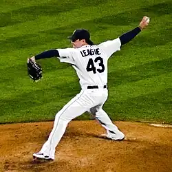League's main pitch is a very hard sinker averaging 96 mph. (In 2011, he had the hardest sinker of any relief pitcher, at 97.3 mph.)[21] He also has an upper-80s slider that he uses primarily early in the count to right-handed hitters. He also has a splitter that he uses as a strikeout pitch. The splitter has a whiff rate of 55%.[22]