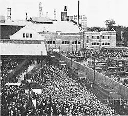 Shortly after the Boston Red Sox opened Fenway Park in 1912, Braves owner James Gaffney purchased the former Allston Golf Club, one mile west of Fenway Park to build a new park for the Braves. Construction of the $600,000 Braves Field began on March 20, 1915, and was completed before the end of the 1915 season.[8][9] The park was constructed entirely of steel (approx 750 tons) and an estimated 8 million pounds (3,600,000 kg) of concrete.[10] Braves Field officially opened on August 18, 1915, with 46,000 in attendance to see the Braves defeat the St. Louis Cardinals 3–1.[11] In his Opening Day coverage, J. C. O'Leary of The Boston Globe described brand new Braves Field as "the finest ballpark in the world. There is not another like it anywhere, and the probability is that it will stand preeminent for the next 25 years." Braves Park was the largest stadium built in that era, with 40,000 capacity and a trolley system leading to the park.[3]