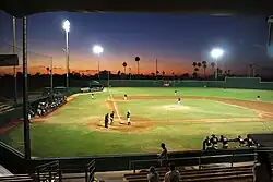 Gold-colored bleachers wrapped around the home plate area, extending to each team's dugouts on either side. The stadium featured lights, making night games possible.