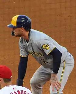 In 2025, Turang's offense improved after he adjusted his batting stance and increased his bat speed.[30] He was named the National League Player of the Month for August. He was the first Brewers player to receive the honor since Christian Yelich in 2018.[31][32] In his third season with Milwaukee, he batted .288/.359/435 with 18 home runs and 81 RBI in 156 games, all career bests.[24] In Game 1 of the NLCS, he gave up a potential game-tying run by "dodging" a Los Angeles Dodgers fastball that would have hit him. He addressed his response on the play as "a natural reaction"; nevertheless, after swinging at a high fastball he would be the final out as the Brewers lost 2-1, leaving three runners on base stranded.[33][34] They were eventually swept in the series.[35]