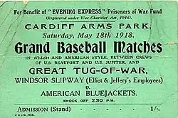 The game in Cardiff had already become a popular summer pursuit among the city's rugby players and the match saw three Cardiff RFC players take the field, including Viv Huzzey, who also represented Wales in rugby union and rugby league. The next international was held in 1914 at Goodison Park, Liverpool. The English won the match in front of 4,000 spectators, but annual internationals would not start until after the war.[24][25] During World War I the English Baseball Association were keen on keeping baseball ticking over in the Liverpool region, despite a lack of experienced players. In February 1916 the annual meeting was held, with the primary topic of discussion being efforts to utilise munitions workers and others to supplement existing teams,[26] and the English Baseball Association organised games to raise funds for the war effort.[27]
