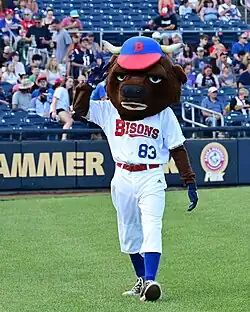 Buster T. Bison has been the official mascot of the Buffalo Bisons since 1983.[41] He was later joined by his cousin Chip in 1994, and his future wife Belle in 2006.[42][43]