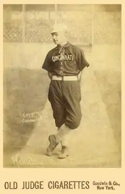 Holliday made his regular-season major league debut in 1889 for the Cincinnati Red Stockings of the American Association.[3] In his first season with the Red Stockings, he led the league in home runs with 19, while finishing in the top ten in many offensive categories. He was fifth in batting average with .321, fifth in runs batted in (RBIs) with 104, third in hits with 181, and ninth in doubles with 28.[2]