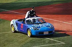 The bullpen car remained in use in Japanese baseball. Most of them are convertibles so that fans can see the players inside, including many one-offs provided to the teams by the manufacturer. In the 1980s, the Yokohama DeNA BayStars of Nippon Professional Baseball introduced a bullpen car, a one-off Datsun Bluebird (910) convertible.[10] It was the first of a few bullpen cars provided by Nissan to their hometown team. It would be followed by a Be-1 and S-Cargo in the 1990s.[11] In 2017, the BayStars began using the Nissan Leaf, while Yasuaki Yamasaki used a Toyota MR-S to enter games.[12][13] The Tokyo Yakult Swallows also use a custom Nissan, a one-off Y34 Cedric roadster.[14] The Hanshin Tigers currently use a modified smart fortwo convertible.[15]