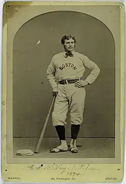 - ^ In the 1870s many teams relied heavily on nine regular players; sharing pitcher and another position or catcher and another position between two players was common. Deacon White was hired in 1873 and played three seasons in Boston as first catcher, otherwise in the outfield. Thus he shared two positions with McVey in 1874–1875. McVey, White, and Al Spalding covered first, catcher, and pitcher in 1876; McVey, Cap Anson, and George Bradley covered third, catcher, and pitcher in 1877 after Spalding retired to first.