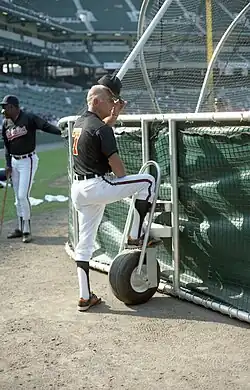 In 1976, Ripken finally reached the major leagues when the Orioles named him their bullpen coach.[15] Halfway through 1977, he became the third base coach for the Orioles when Billy Hunter was hired to be the manager of the Texas Rangers.[16] Ripken served in this role through the 1986 season. During this time, and even later when he became a manager, he pitched batting practice and hit fungoes before games.[5][7] He was one of the last members of the team to leave after games. Ripken could be tough on the players he coached, enjoying using the term "lunkhead" when talking to them, but he always made time to answer any questions they had about the game.[11]