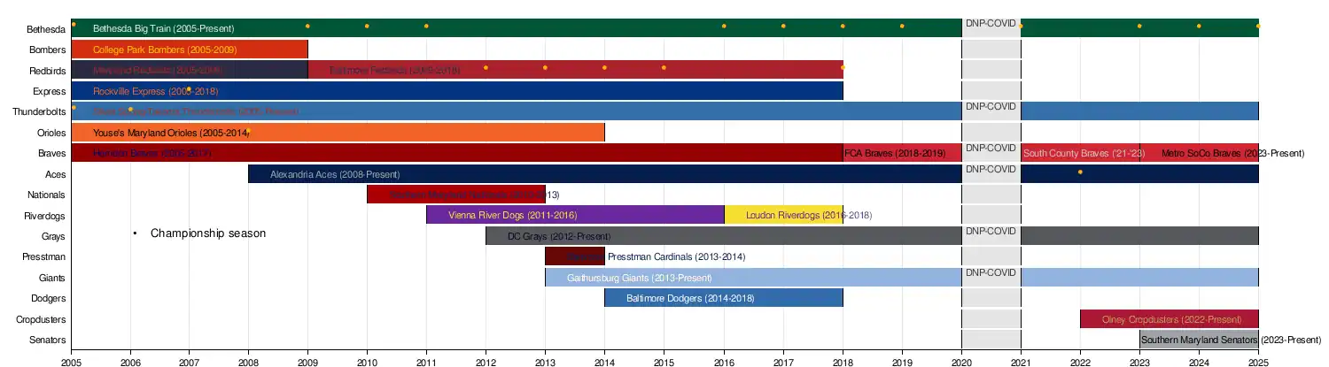 In 2011, the Vienna River Dogs became the ninth team in the league and the third in Northern Virginia. The league expanded into Washington, D.C., when the D.C. Grays joined for the 2012 season. In 2013, the Baltimore Presstman Cardinals and the Gaithersburg Giants joined the League. In 2014, the Southern Maryland Nationals shut down and the Cardinals were replaced by the Baltimore Dodgers.[5][6] Youse's Maryland Orioles left after the season. In 2015, the League changed to a two-division format with a playoff. After the 2018 season, the Baltimore Redbirds, Rockville Express, Baltimore Dodgers, and Loudoun Riverdogs left the League. Cropdusters Baseball joined the League in 2022 and the Southern Maryland Senators joined in 2023.