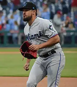 On November 20, 2017, Smith was traded to the Miami Marlins along with Garrett Cooper in exchange for pitcher Mike King and international bonus pool money.[12] Smith earned a spot in the Marlins' Opening Day starting rotation and was pitching effectively until he severely strained and tore his lat muscle from the bone during a game against the Rockies on June 26. He opted to have season-ending surgery which ended his 2018 campaign.[13] He posted a 5–6 record as a rookie with a 4.19 ERA and 88 strikeouts in 77.1 innings pitched.