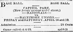 Contemporary newspaper advertisements (see below) give the location as "New Jersey Avenue and C Street", which would put the small ballpark slightly northwest of the Capitol rather than northeast. Local papers also give the location as "adjoining the Baltimore and Ohio depot",[3] which old maps place on the block bounded by North Capitol, New Jersey Avenue NW, C Street NW and D Street NW (see external link).