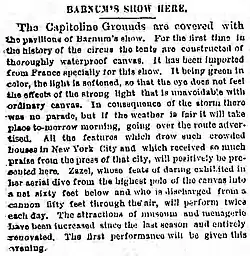 In September 1873, Washington Donaldson, a professional balloonist who had formerly worked for P.T. Barnum as a circus performer, along with fellow balloonist John Wise, collaborated on an attempt to cross the Atlantic Ocean in a hot-air balloon. Sponsored by the Daily Graphic, the launch was to take place from the Capitoline Grounds, with Wise planning to use a balloon 49 meters (160 feet) tall with a two-compartment enclosed car, but decided to end his involvement with the project. Donaldson persisted, acquiring a smaller balloon with an open boat for the car.[19]