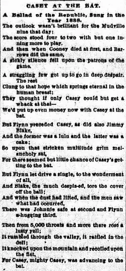"Casey at the Bat: A Ballad of the Republic, Sung in the Year 1888" is a mock-heroic poem written in 1888 by Ernest Thayer. It was first published in The San Francisco Examiner (then called The Daily Examiner) on June 3, 1888, under the pen name "Phin", based on Thayer's college nickname, "Phinney".[1] Featuring a dramatic narrative about a baseball game, the poem was later popularized by DeWolf Hopper in many vaudeville performances.[2][3] It has become one of the best-known poems in American literature.