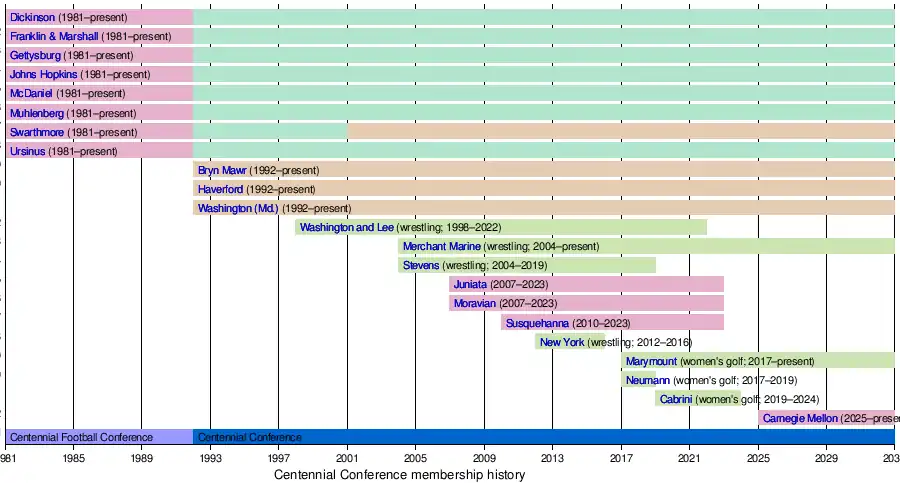 - 2025 β Carnegie Mellon University joined the Centennial as an associate football member, beginning the 2025 fall season (2025β26 academic year).