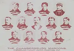 The Maroons were created in 1895 by local businessman Clay "Pop" Henninger, who ran a thriving hat shop in Chambersburg.[4] They began play at Wolf Park, the same location throughout their entire tenure. The Maroons were charter members of the Cumberland Valley League, an independent minor league,[5] and won the first league title in 1895.[6] In the following season, the Maroons finish in second place in the league, boasting a 22–14 record. The 1896 Maroons squad boasted a total of seven future Major League Players.