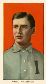 Carr served as a player-manager for the Indianapolis Indians of the American Association from 1906 to 1910.[3] On July 27, 1906, Carr entered the crowd during a game in Indianapolis and struck a spectator three or four times in the head, knocking him down and causing him to sprain his wrist. He was tried for assault in August but acquitted due to a jurisdictional technicality.[11] His 1908 Indianapolis team won the American Association pennant with a 92–61 record. Carr hit .301 in 522 at bats in 1908. Other key players on the 1908 team included Rube Marquard, Donie Bush, and Ed Siever.[12] The Indians drew 500,000 spectators in 1908.[2] Jack Hayden, who led the 1908 team with a .316 average, credited Carr with the team's success: "We have played under a leader who sympathizes with us. He always had courage and instilled courage in the team. We have been a happy family and it is with a great deal of regret that we part."[13]