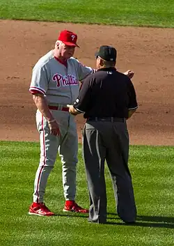 In 2013, Manuel won his 1,000th game on August 12.[34] However, Manuel did not win another game with the Phillies, and after the team lost their 15th game out of 20 after the All-Star Break, Manuel was fired on August 16. He was replaced by third-base coach Ryne Sandberg.[35] Reaction around the league and from the Phillies fan base mostly consisted of sadness and gratitude to Manuel for his tenure.[36] Several Phillies veterans, including Chase Utley and Cole Hamels, expressed regret and guilt, believing their lack of production led to Manuel's firing; they said that they viewed Manuel as a fatherly figure.[37] Sandberg commented the next day, "It was a roller coaster of a day emotionally. It affected me and I think it affects the players."[38] Manuel received praise from the media for his class in handling the situation,[39] and sportswriters mostly exonerated him of the blame for the Phillies' performance, focusing on his not having had better players.[40][41] When asked if he had enough pieces to win the last two years, he said "The last two years? No. I can straight face tell you that."[42] He finished with a record of 780 wins and 636 losses.[18] Of the six managers to have lasted for twelve seasons in the position in Major League Baseball, Manuel is the only one to have won 1,000 games. He is also one of just a dozen managers to have won a thousand games without having also lost a thousand as well (of those, six are in the Hall of Fame). Despite stepping down, Manuel returned to the Philles in 2019 as a senior advisor to the General Manager.