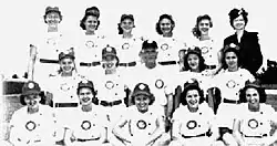 Front row, L-R: Doris Tetzlaff, Charlene Barnett, Betty Whiting, Marilyn Olinger, Beulah Anne Georges. Eileen Albright, Rita Briggs. Second row, L-R: Donna Cook, Betty Tucker, Dave Bancroft (manager), Mirtha Marrero, Migdalia Pérez. Back row, L-R: Kathryn Vonderau, Josephine Kabick, Eleanor Callow, Dolores Wilson, Dorice Reid, Margaret Johnson (chaperone).