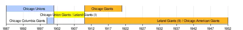 | The Chicago Unions and the Chicago Columbia Giants merged for the 1901 season creating the Chicago Union Giants, who later changed their name to the Leland Giants. The Leland Giants then split into two teams for the 1910 season creating the Chicago Giants and the new Leland Giants, who later changed their name to the Chicago American Giants. |