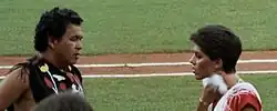 conferring before a 1983 game.