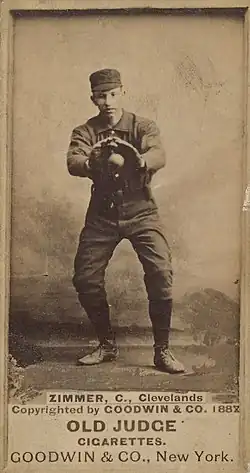 Unlike many baseball players of his era, Zimmer used neither liquor nor tobacco. In 1890, the Sporting Life reported that there were likely no more than a half a dozen professional baseball players who could match Zimmer's claim: "He has never taken a drink of any kind of intoxicating liquor in his life, and has never used tobacco in any shape."[3] Zimmer later attributed his long playing career (and long life) to the fact that he never didn't smoke, didn't chew, and didn't drink.[6] Despite his personal aversion to tobacco, Zimmer in the 1890s was successful in operating a wholesale and retail cigar business in Cleveland. In 1898, as he traveled with the Cleveland team, he carried a valise with samples of the cigars that he sold. Commenting on Zimmer's business ingenuity in promoting his cigar business while traveling at the expense of the Cleveland club, the Sporting Life wrote: "With such an instinct for taking advantage of circumstances Zimmer is certain to be prosperous."[45]