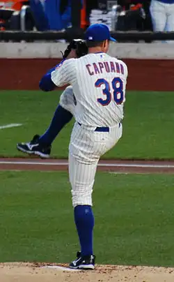Capuano signed with the New York Mets prior to the 2011 season.[27] On August 26, 2011, while pitching against the Atlanta Braves, he threw his first complete game shutout since 2005, setting a career-high with 13 strikeouts in the game.[28] During the 2011 season, Capuano made 31 starts for the Mets—his most since 2006—and also appeared twice in relief. He finished the season with an 11–12 record and a 4.55 ERA.[13]
