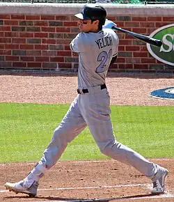Yelich was projected to bat third to start 2016.[30] He hit well in that spot, and managed to increase his power output.[31][32] On April 23, in a game against the San Francisco Giants, Yelich hit three doubles, which tied a franchise record.[33] Defensively, Yelich was a starting outfielder, alongside Ozuna and Giancarlo Stanton.[34] In late May, Yelich missed some time due to back spasms.[35][36] After Stanton was placed on the disabled list, Ozuna played Stanton's usual position in right field, while Yelich took Ozuna's spot in center on days that backup outfielder Ichiro Suzuki was unavailable.[37]